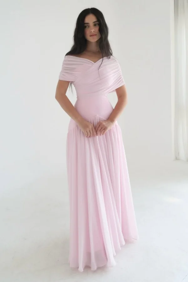 3. Trendy Pink Off-the-Shoulder Prom Dress (Pleated Floor Length)