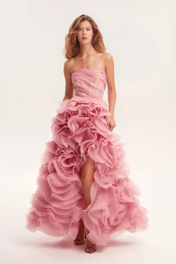 Drama, but make it pink. This gown isn’t shy—it comes with bold ruffles, a daring split, and enough personality to make sure all eyes stay on you. It’s the definition of “extra,” and we love it.