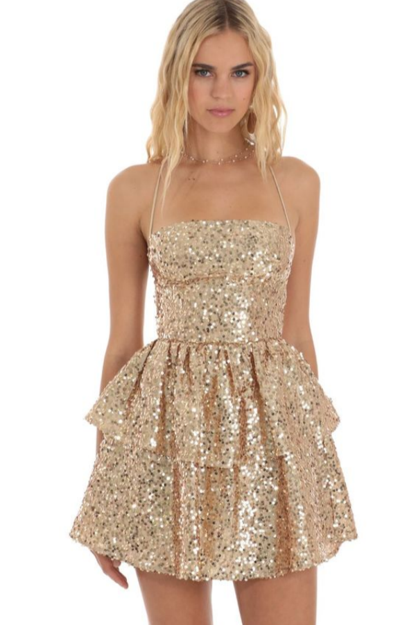 And for the girls who love flirty and fun, the Gold Glitter Halter Mini is just perfection. It’s sparkly, short, and designed for twirling on the dance floor—plus it’s only $79.